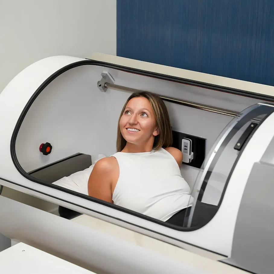 Relax comfortably in a hyperbaric chamber while breathing concentrated oxygen in a pressurized environment. This process allows oxygen to dissolve more efficiently into the bloodstream, supporting: